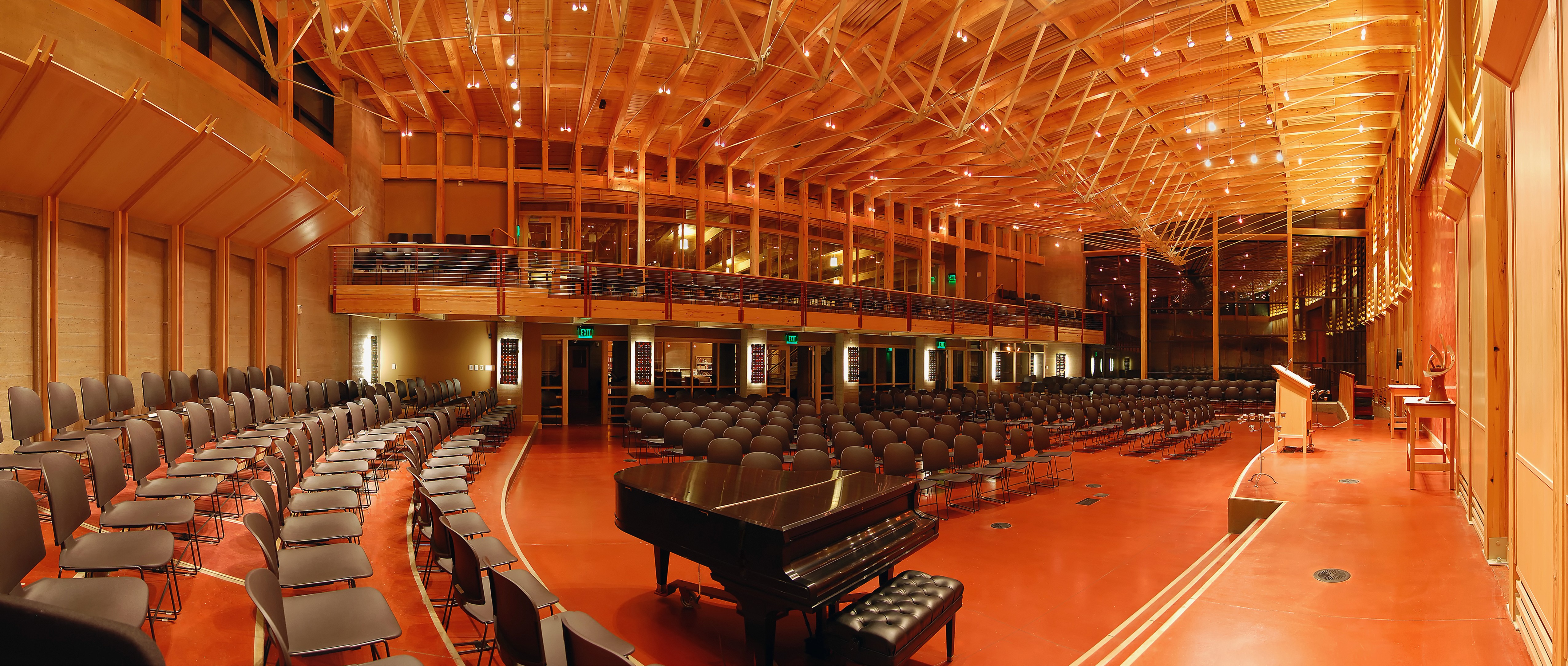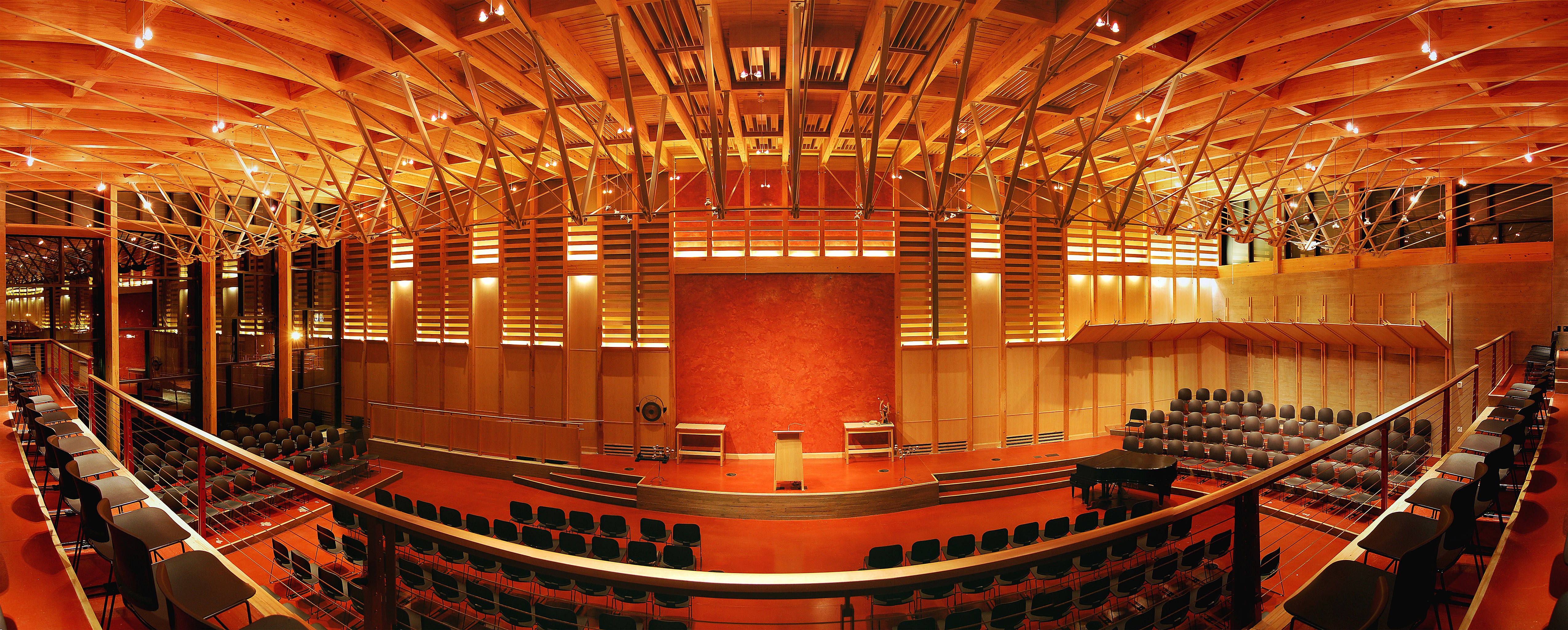 The main hall ethereal lighting system accentuates Frank Lloyd Wright’s signature “Navaho Red” floor colouring thereby imparting a warm glow throughout the space and reinforces the Society’s history of weaving with a textured slatted wood wall treatment which also functions as an acoustical bafflement. This project received an IES Illumination Awards’ Award of Merit.