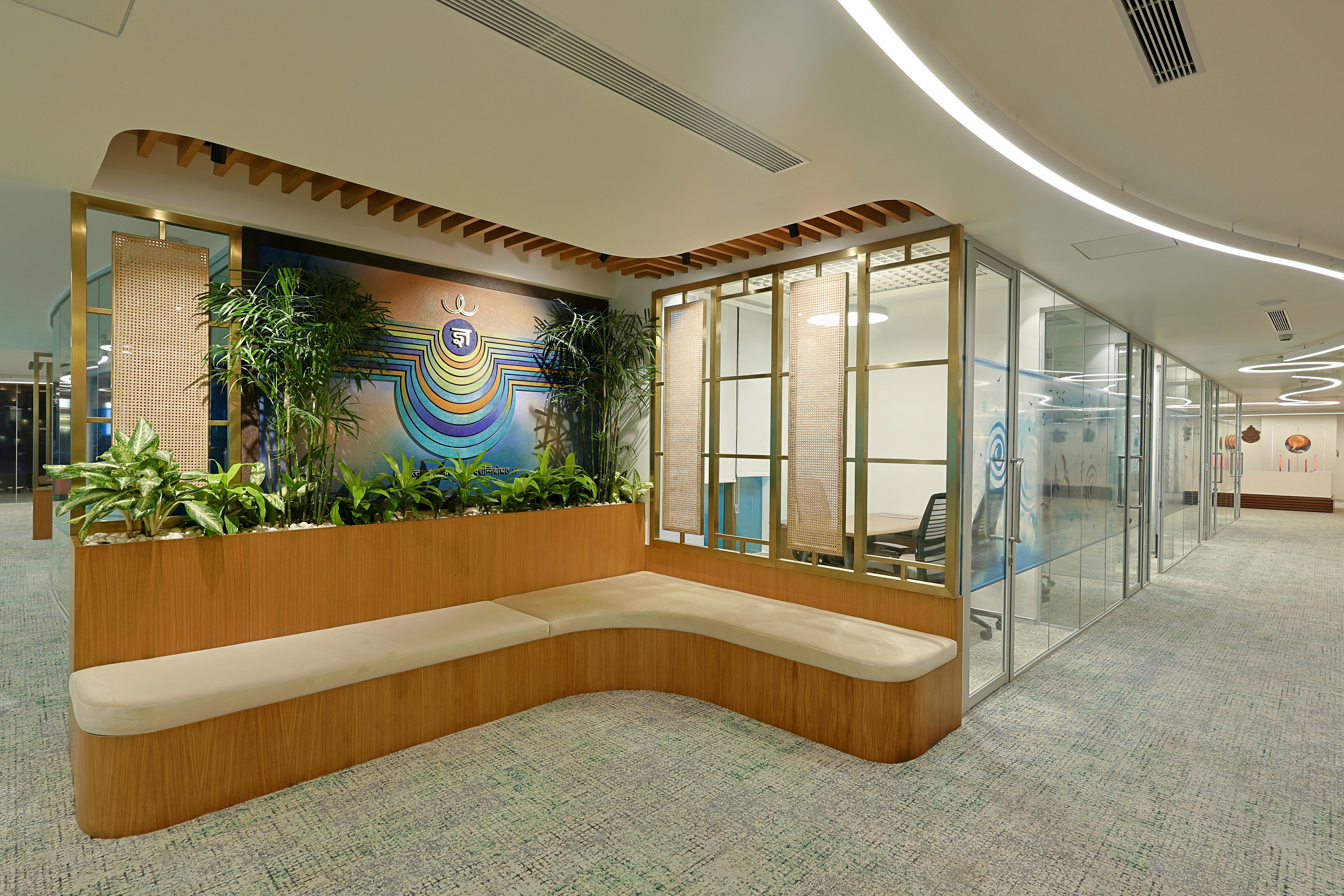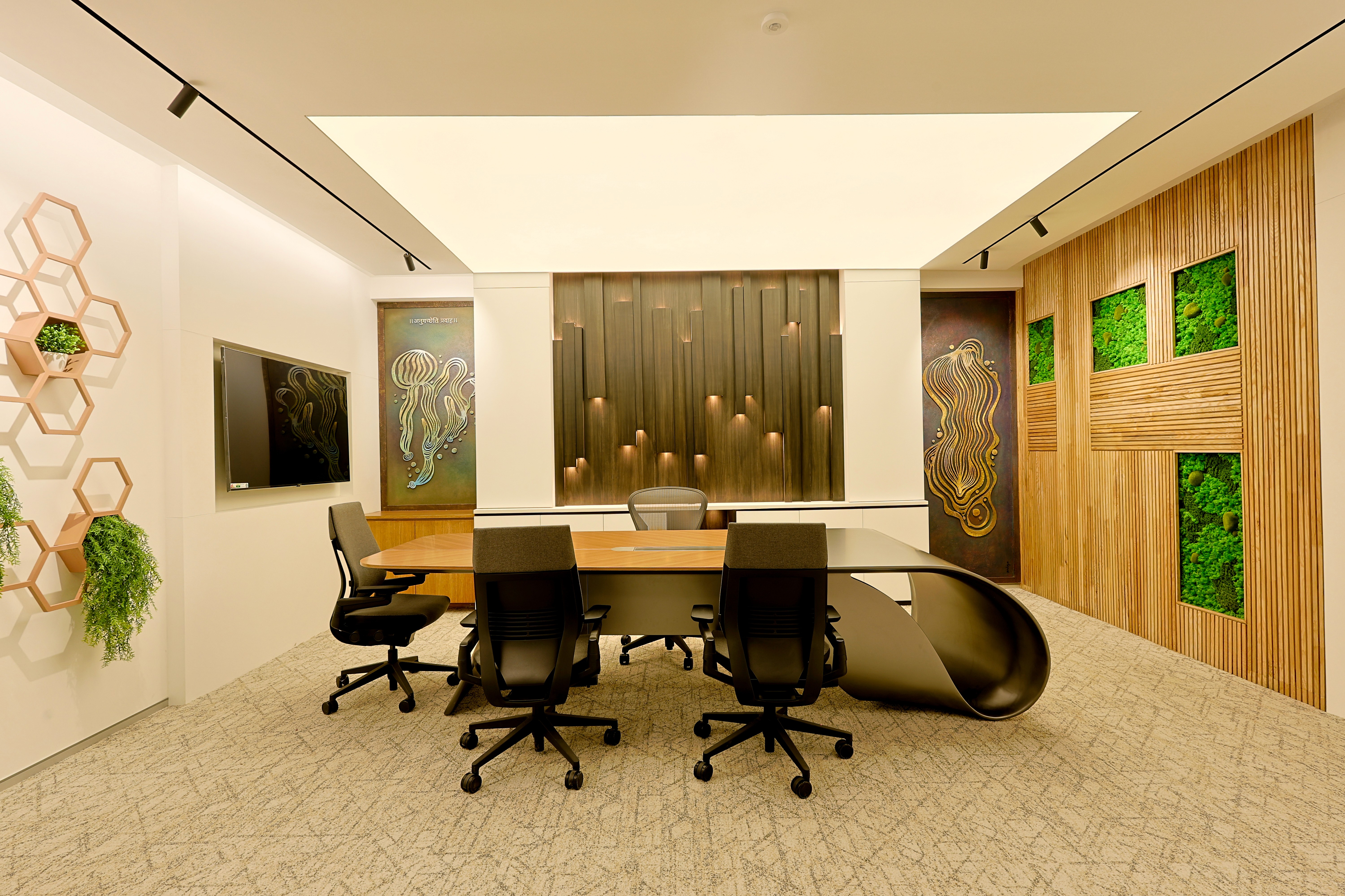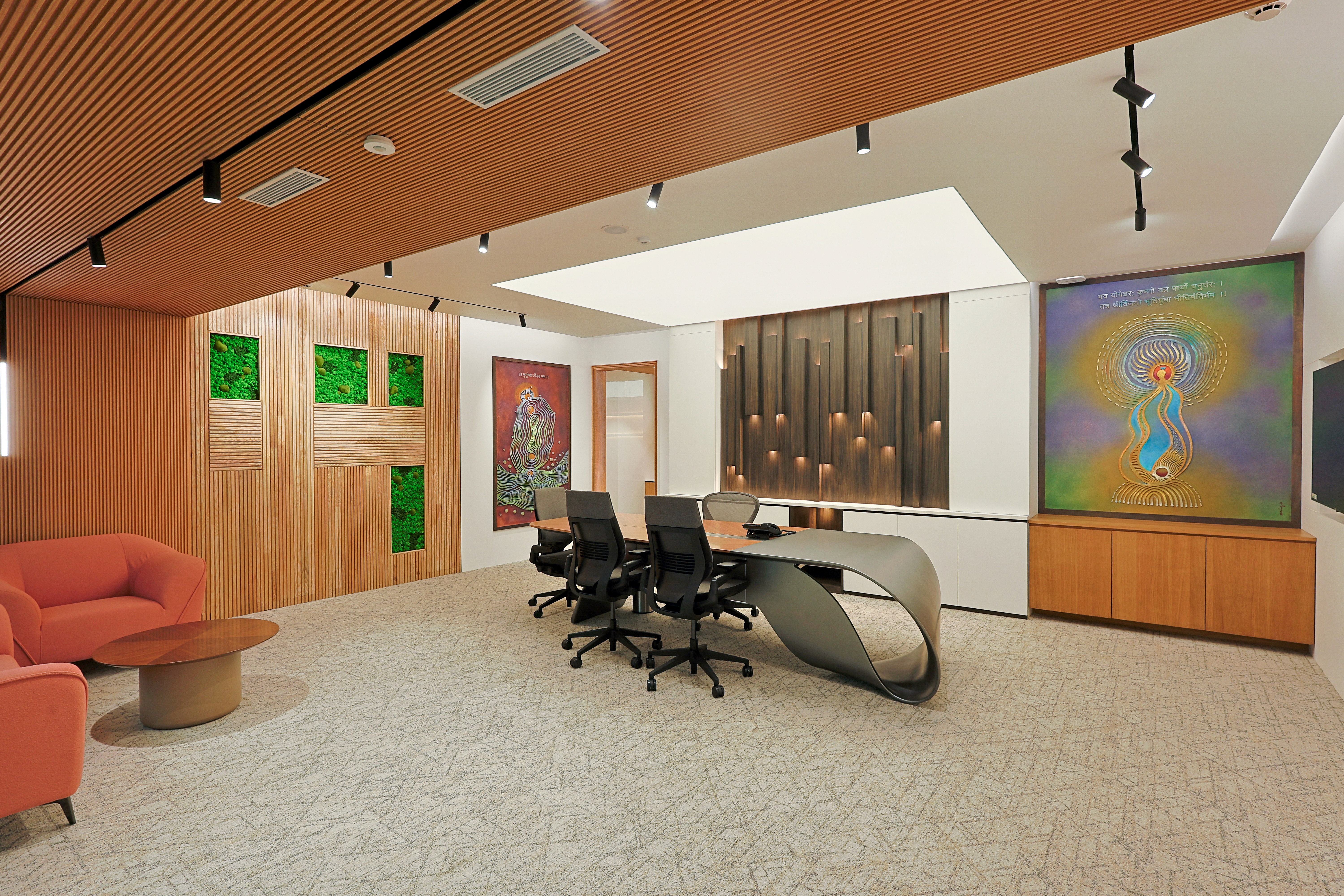 The design was conceived as a reflection of the client’s core business philosophy, rooted in Green Principles and expressed in an abstract, almost spiritual manner. Lighting became the medium that reinforced this vision, shaping spaces that were vibrant yet sensitively attuned to the unique personalities of the office bearers. With technology and hardware seamlessly integrated, the focus remained solely on the experiential effect of light. Art woven into the architectural fabric was illuminated with quiet precision, allowing it to resonate effortlessly within the interiors.