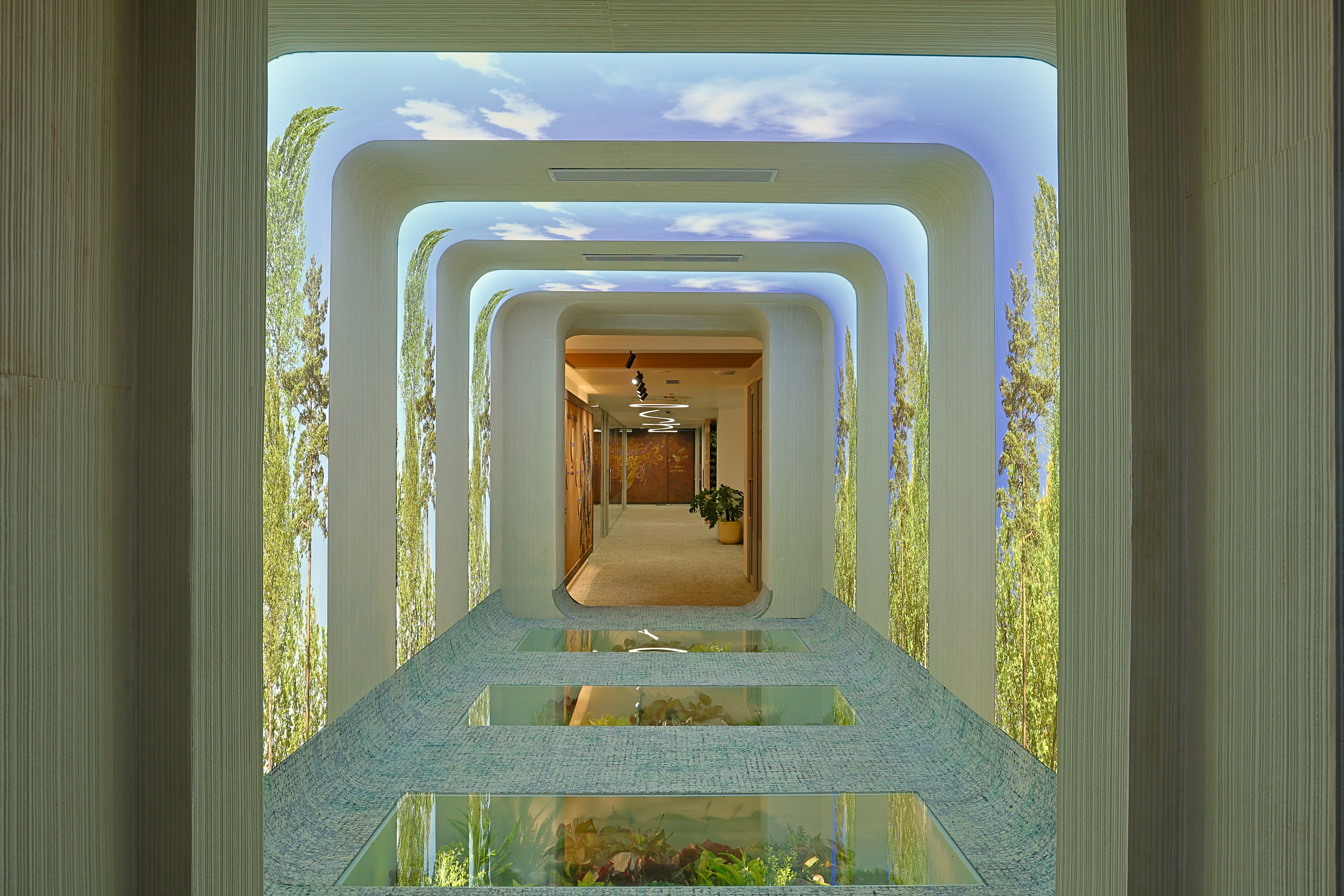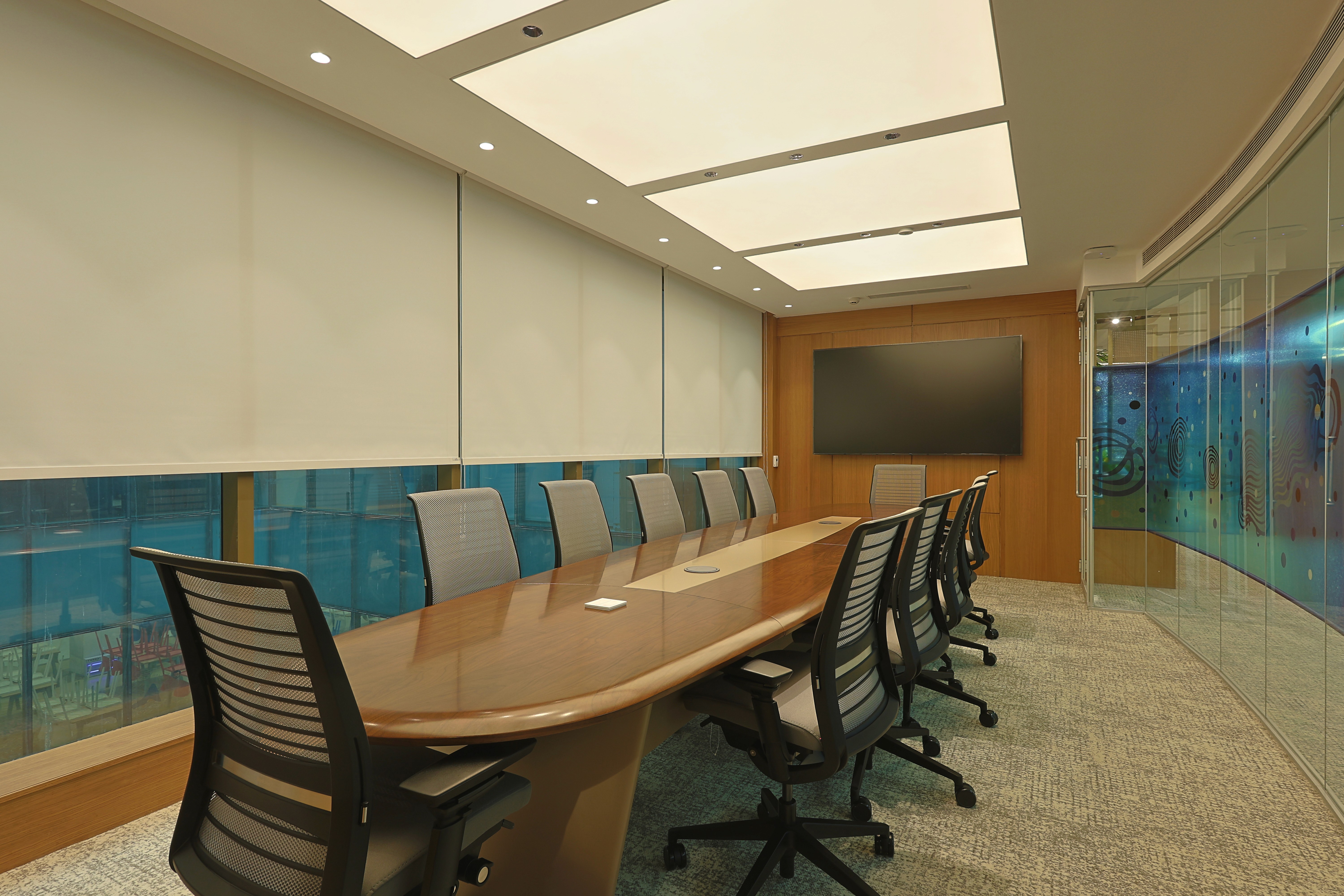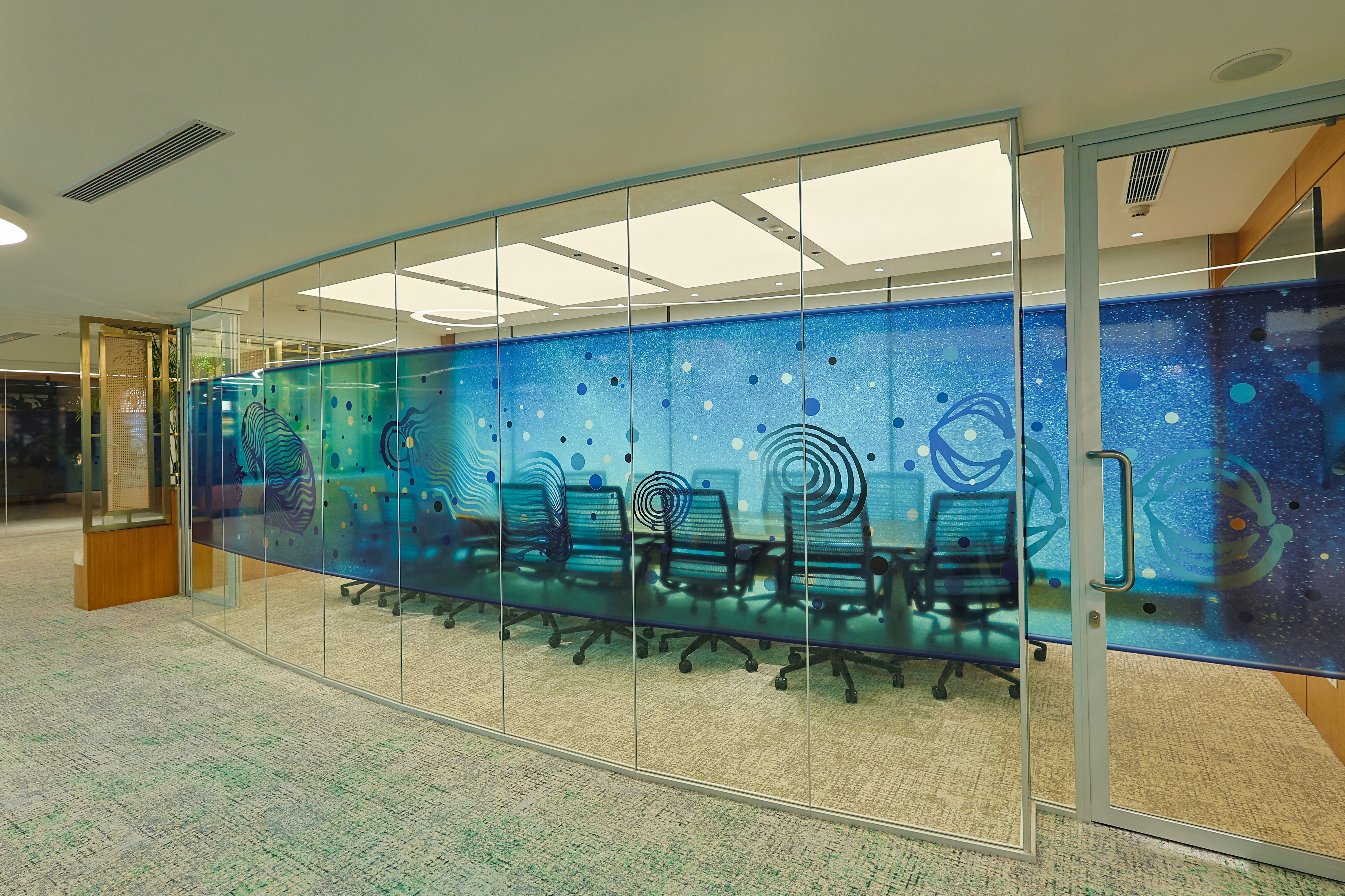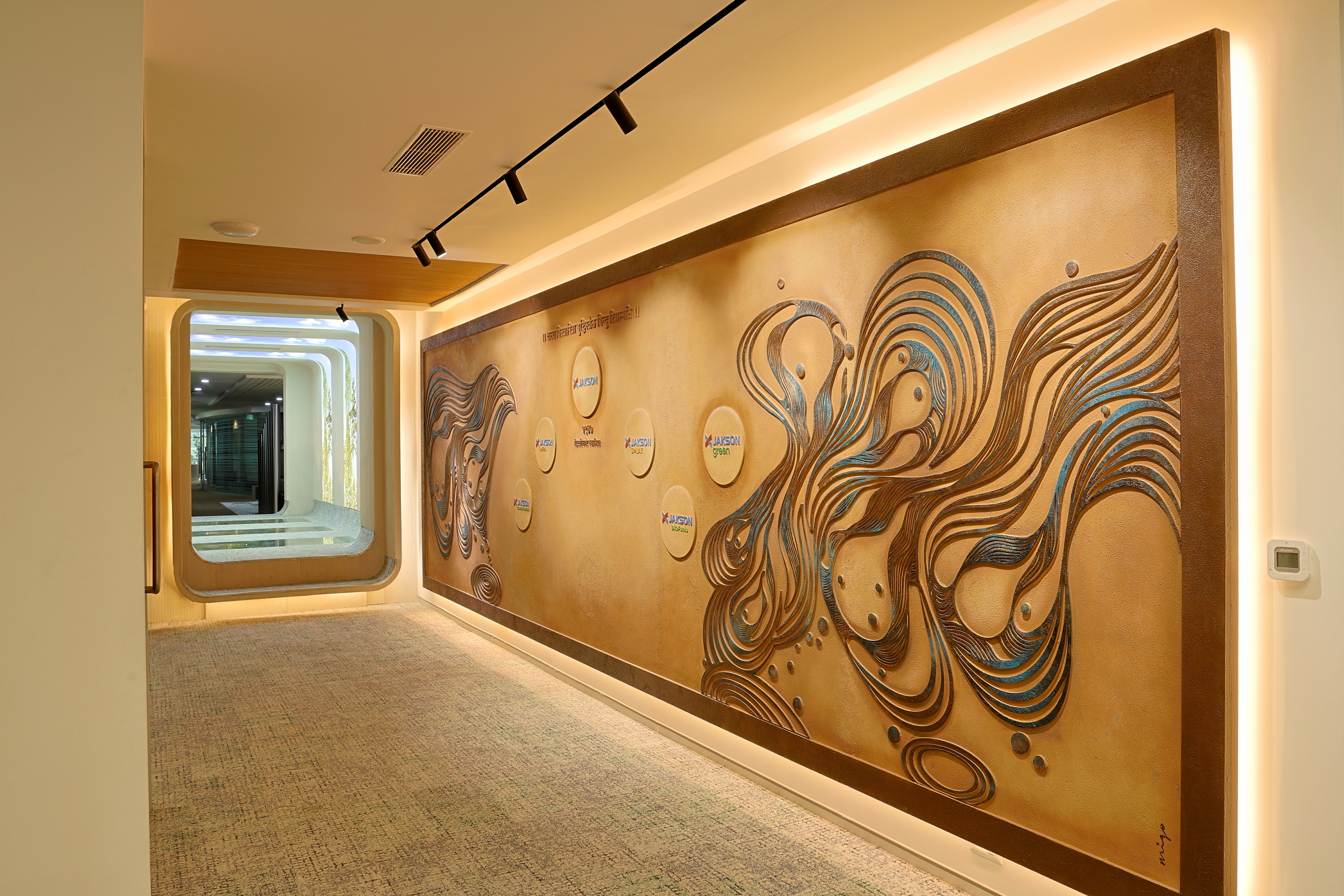 The design was conceived as a reflection of the client’s core business philosophy, rooted in Green Principles and expressed in an abstract, almost spiritual manner. Lighting became the medium that reinforced this vision, shaping spaces that were vibrant yet sensitively attuned to the unique personalities of the office bearers. With technology and hardware seamlessly integrated, the focus remained solely on the experiential effect of light. Art woven into the architectural fabric was illuminated with quiet precision, allowing it to resonate effortlessly within the interiors.