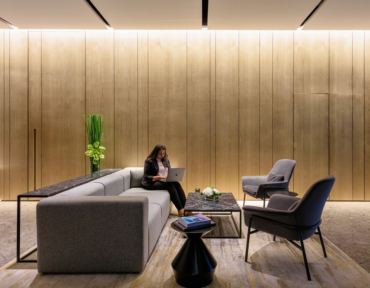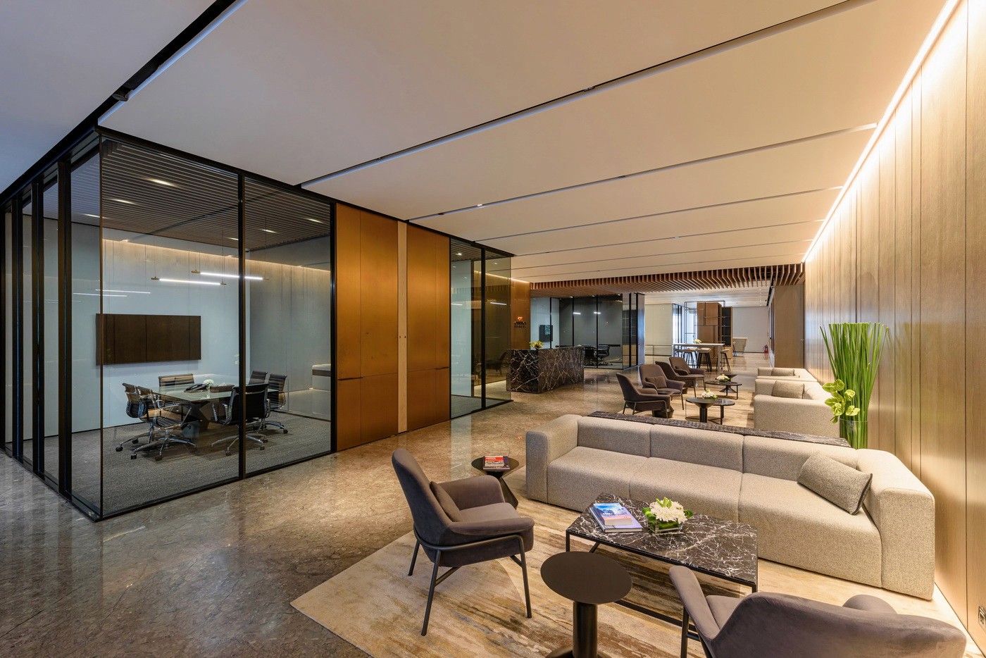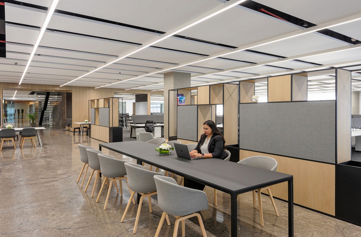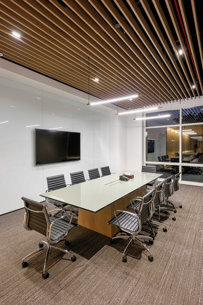 The expansive floorplate with extensive perimeter glazing posed the unique challenge of variable daylight and glare. This was effectively resolved with a DALI-based zoned daylighting and motorized shading system, ensuring uniform illumination while mitigating glare and excessive brightness. Expressive layers of light—pendants, wall grazers, and track systems—added depth and character to client-facing spaces such as the material library, lounges, and conference rooms. The result was a workplace that enhanced the employee comfort while embodying the brand’s refined identity.