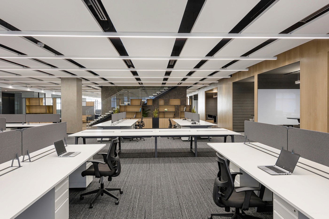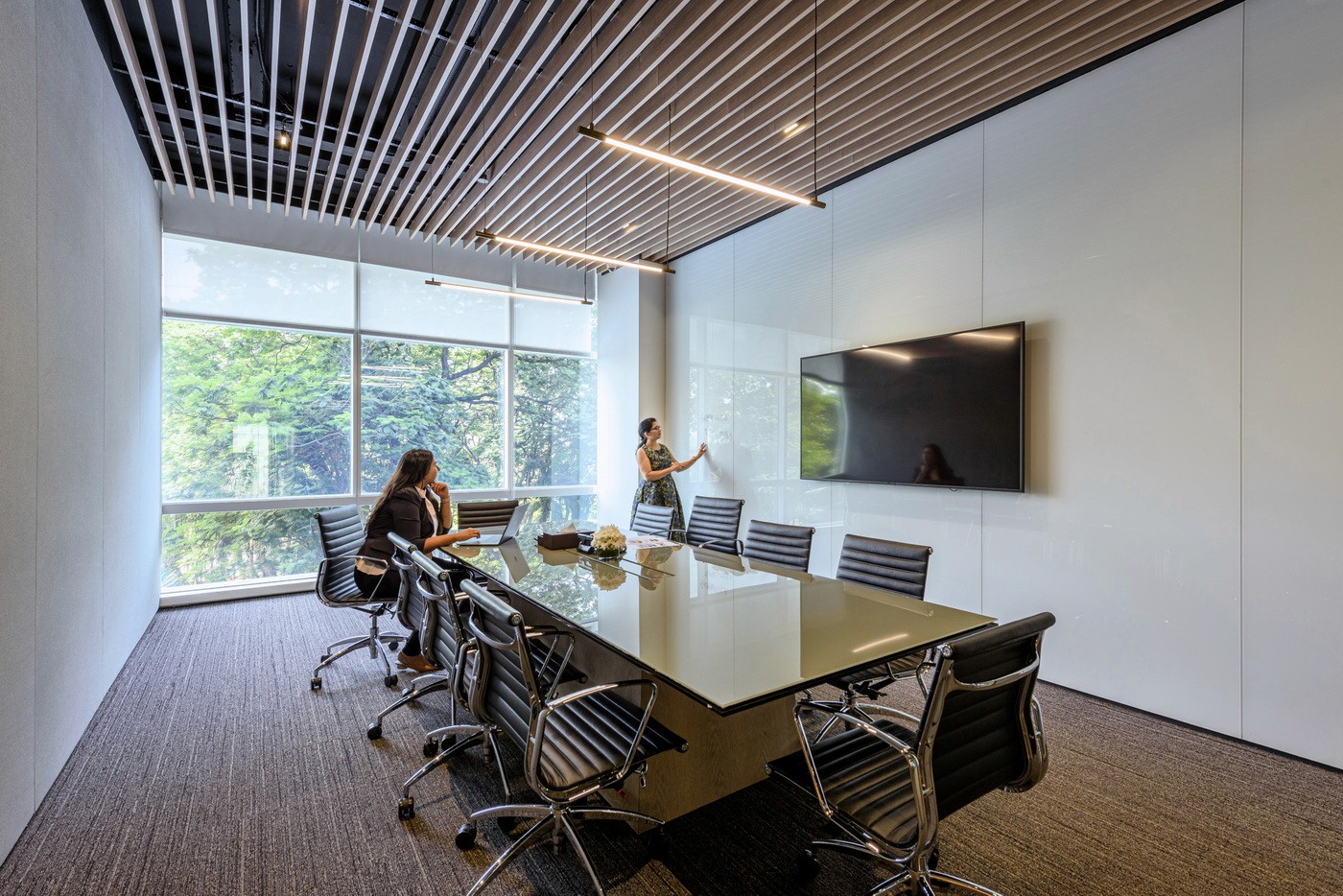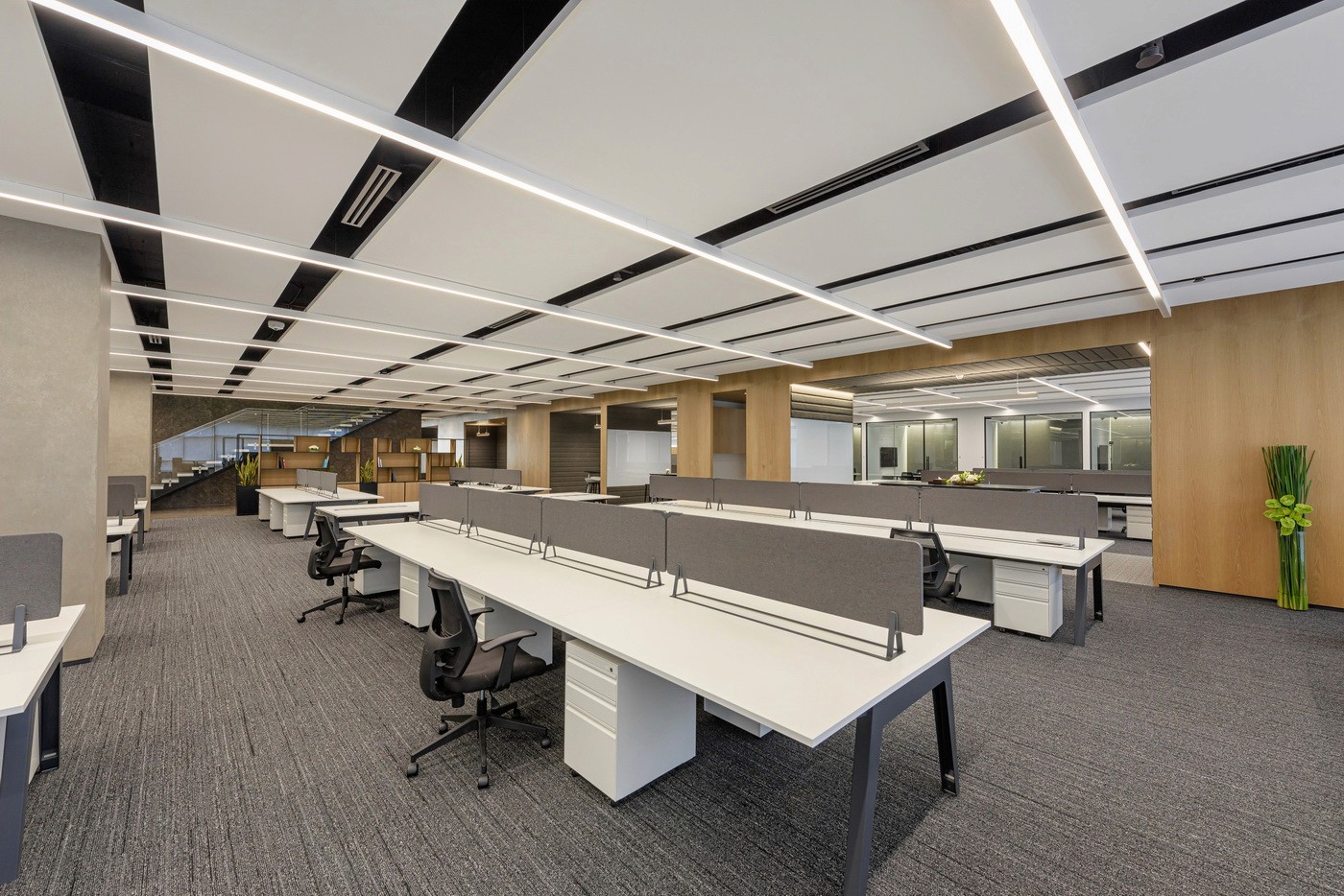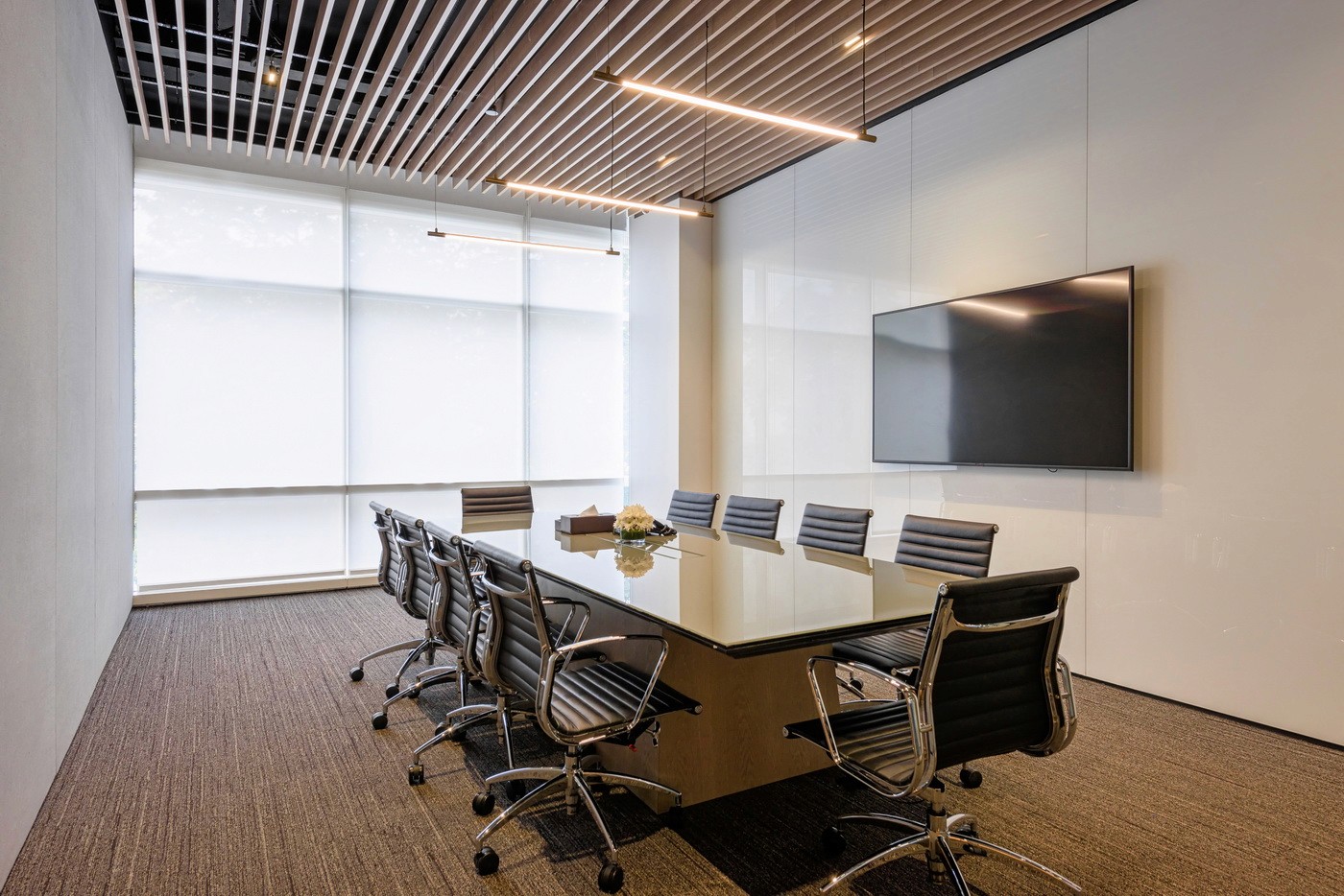 The expansive floorplate with extensive perimeter glazing posed the unique challenge of variable daylight and glare. This was effectively resolved with a DALI-based zoned daylighting and motorized shading system, ensuring uniform illumination while mitigating glare and excessive brightness. Expressive layers of light—pendants, wall grazers, and track systems—added depth and character to client-facing spaces such as the material library, lounges, and conference rooms. The result was a workplace that enhanced the employee comfort while embodying the brand’s refined identity.